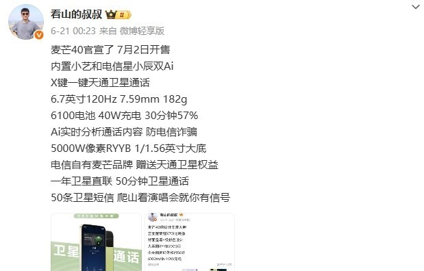 【CNMO科技消息】此前,电信官方宣布将推出新一代麦芒AI手机。根据最新官宣消息,中国电信麦芒40手机上市暨星小辰终端智能体发布会将于6月25日14:30正式举行。CNMO获悉,已经有数码博主提前放出麦芒40手机的详细参数功能。